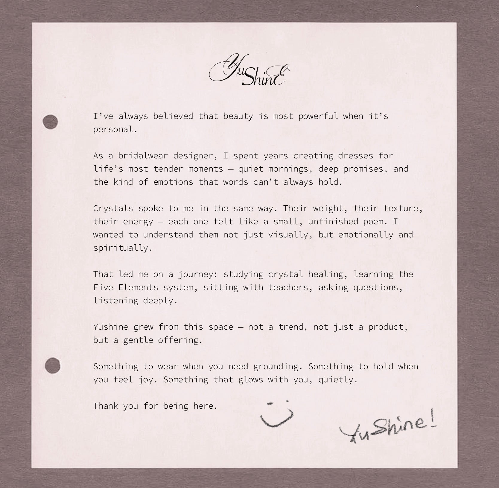 Guided by a Five Elements master and grounded in deep study of crystal energy, she founded Yushine as a brand of intentional adornment — where every piece is a soft ritual, a personal anchor, a way to shine from within.