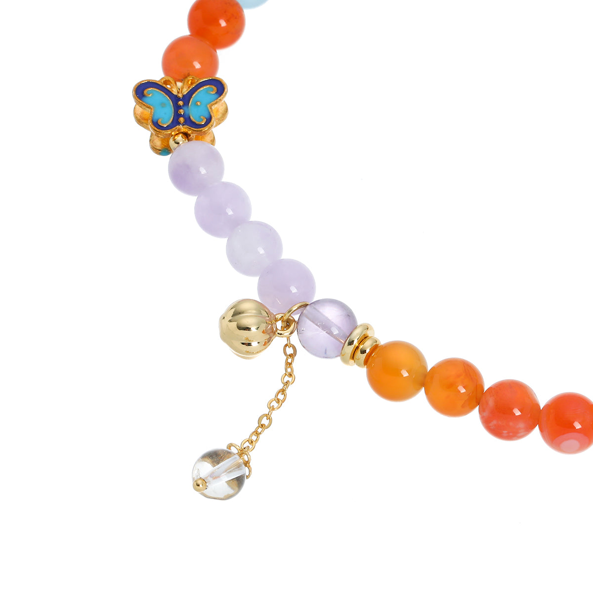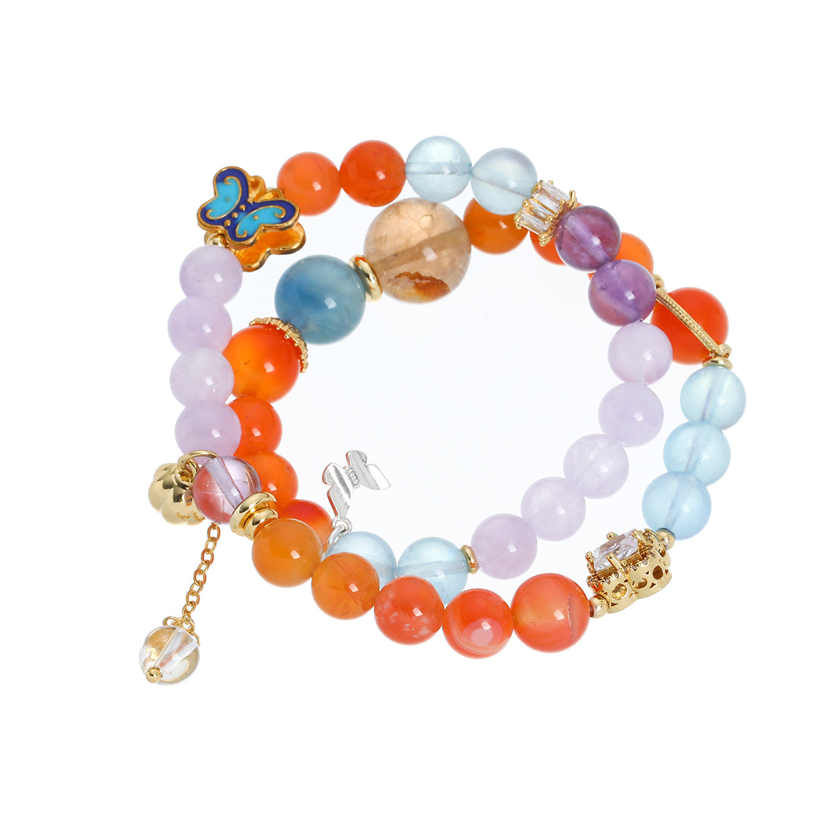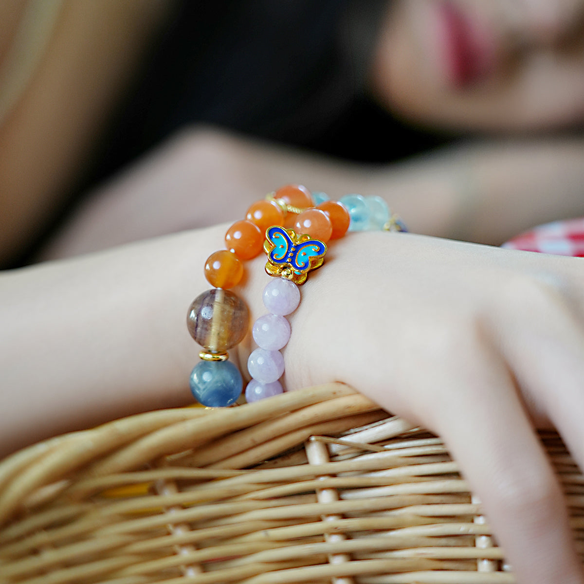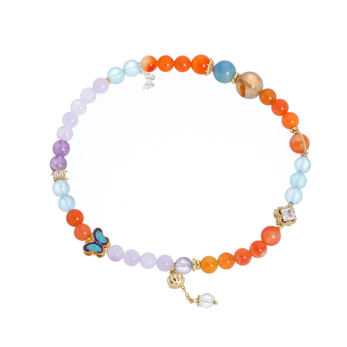 Crafted with Persian Agate and Aquamarine, it brings together grounding energy and fluid serenity. The rich orange-red of Persian Agate ignites vitality and joy, while Aquamarine cools and clears the mind like a soft sea breeze. Blue fluorite adds an intuitive depth, while amethyst lends a quiet clarity. Accented with a butterfly charm, golden spacers, and a touch of yellow floral resin, the palette is joyful yet balanced — like sunlight on water.