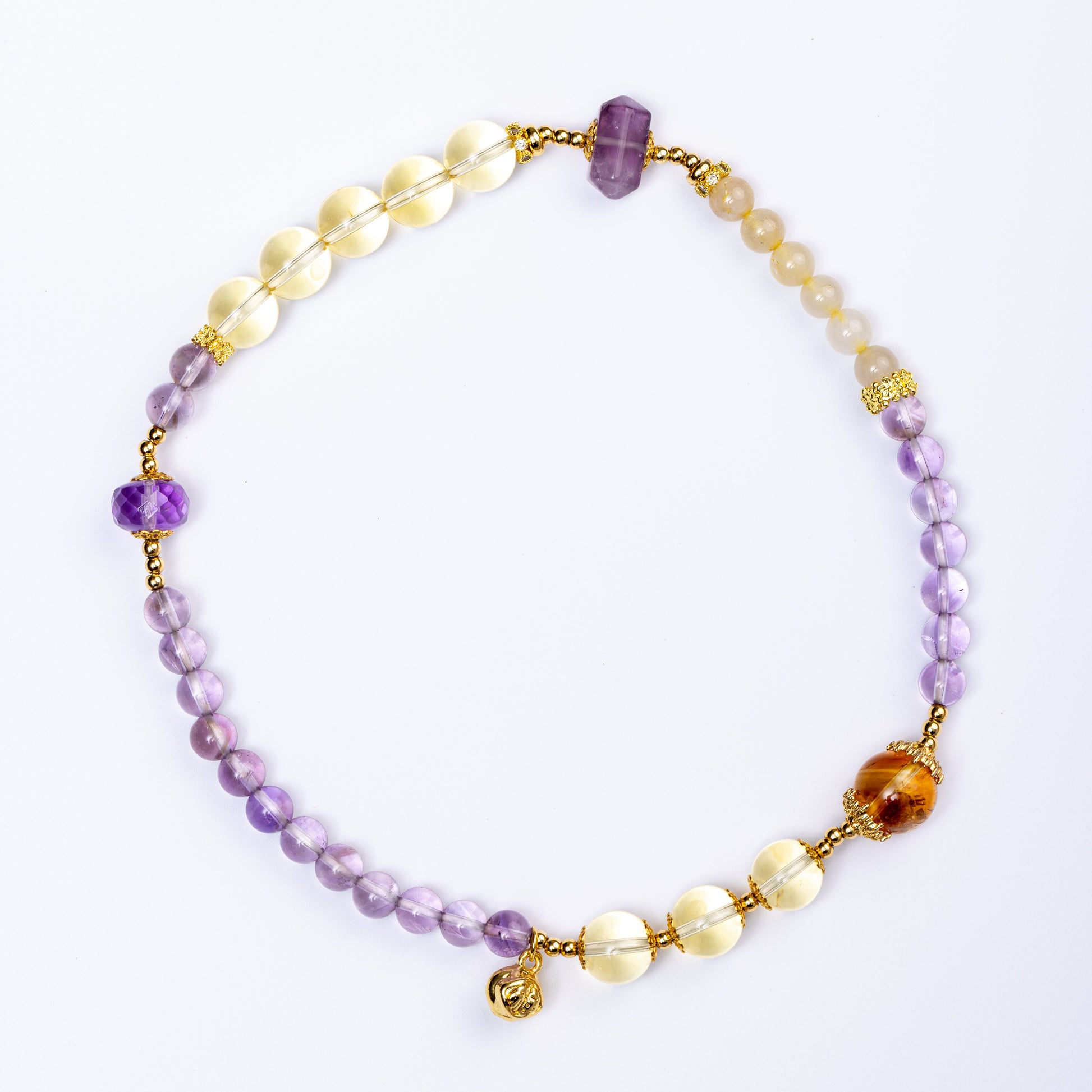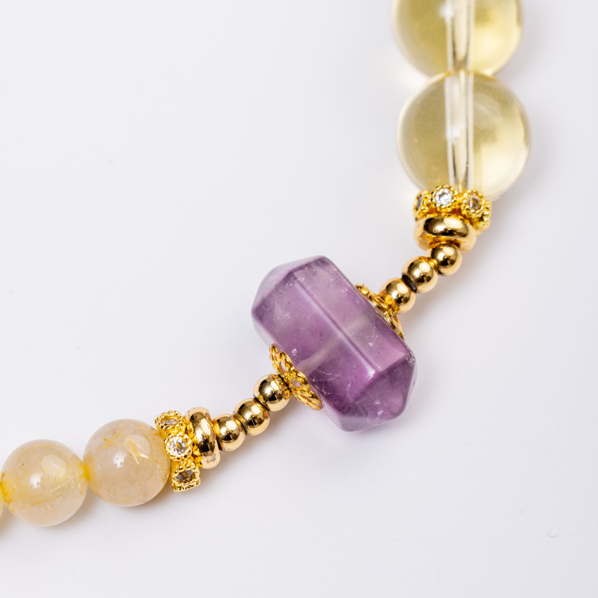 A vibrant ode to duality, this bracelet pairs the regal depth of Amethyst with the sunny brilliance of Lemon Quartz, woven together with delicate gold-toned spacer beads that catch the light like fleeting sunset rays.