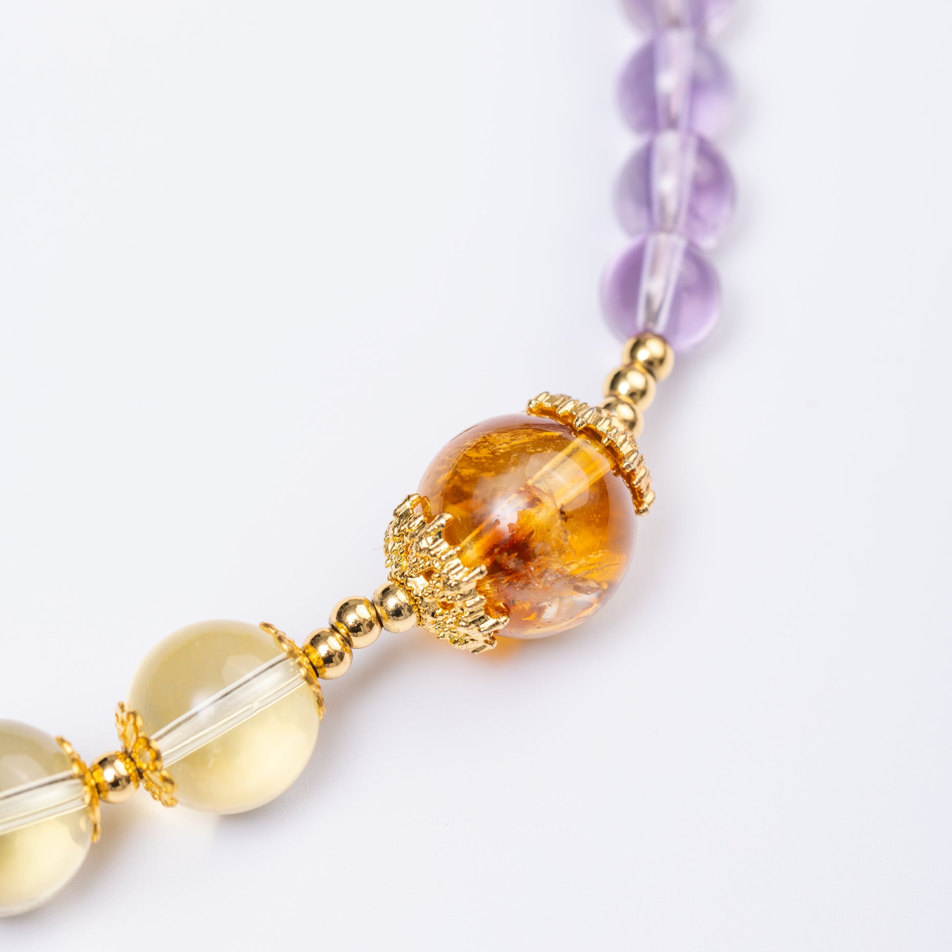 The Amethyst stones, ranging from pale lilac to royal purple, carry the wisdom of introspection and spiritual clarity. In contrast, the Lemon Quartz beads burst with citrus-bright energy, sparking creativity and joy. The warm gold accents bridge these opposing forces, creating a harmonious balance between contemplation and vivacity.