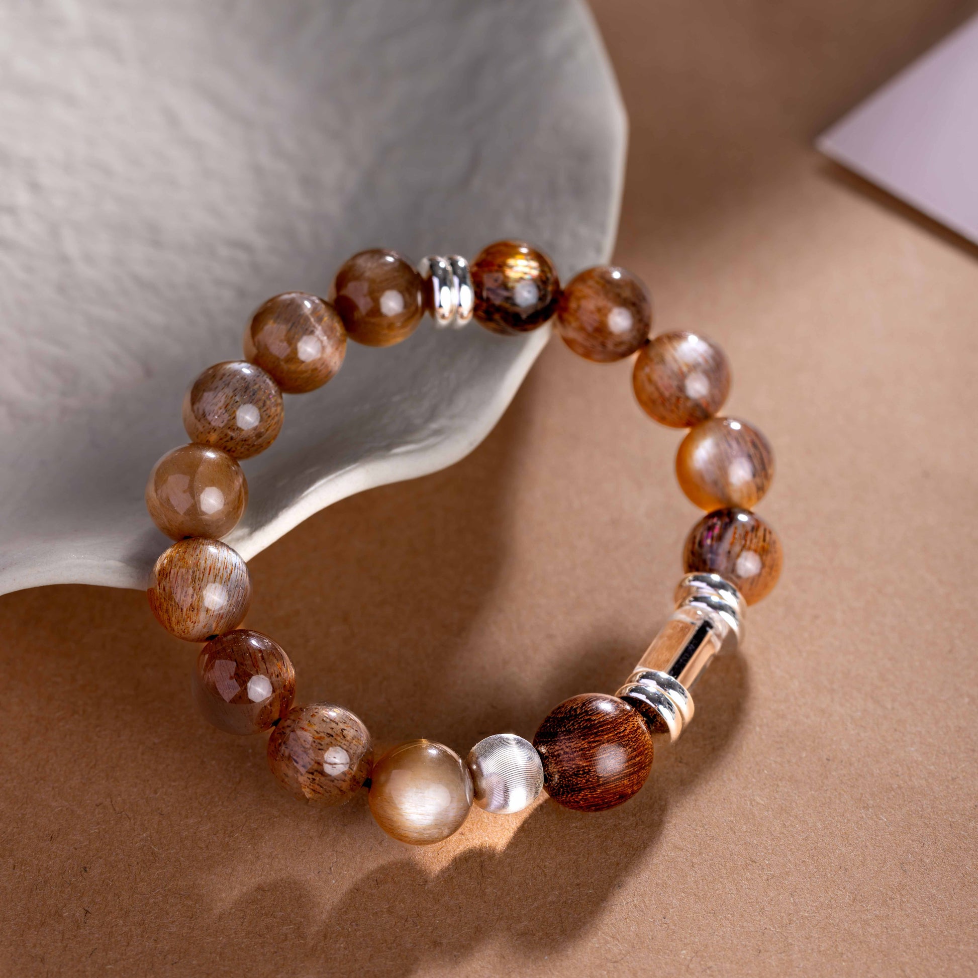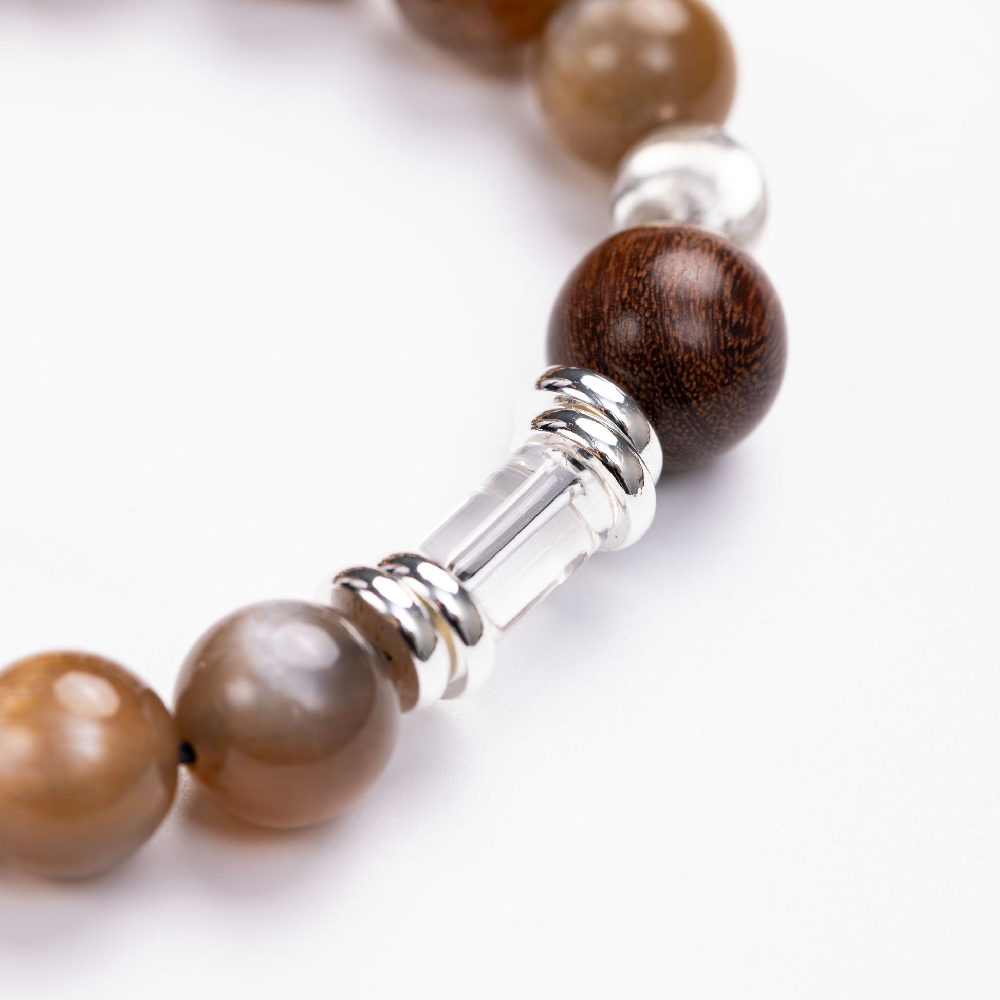 Connect to ancient earth wisdom with this grounding elastic bracelet, featuring raw Skeleton Quartz alongside elongated Clear Quartz points and Golden Phoebe wood beads in a deep earthy color palette.