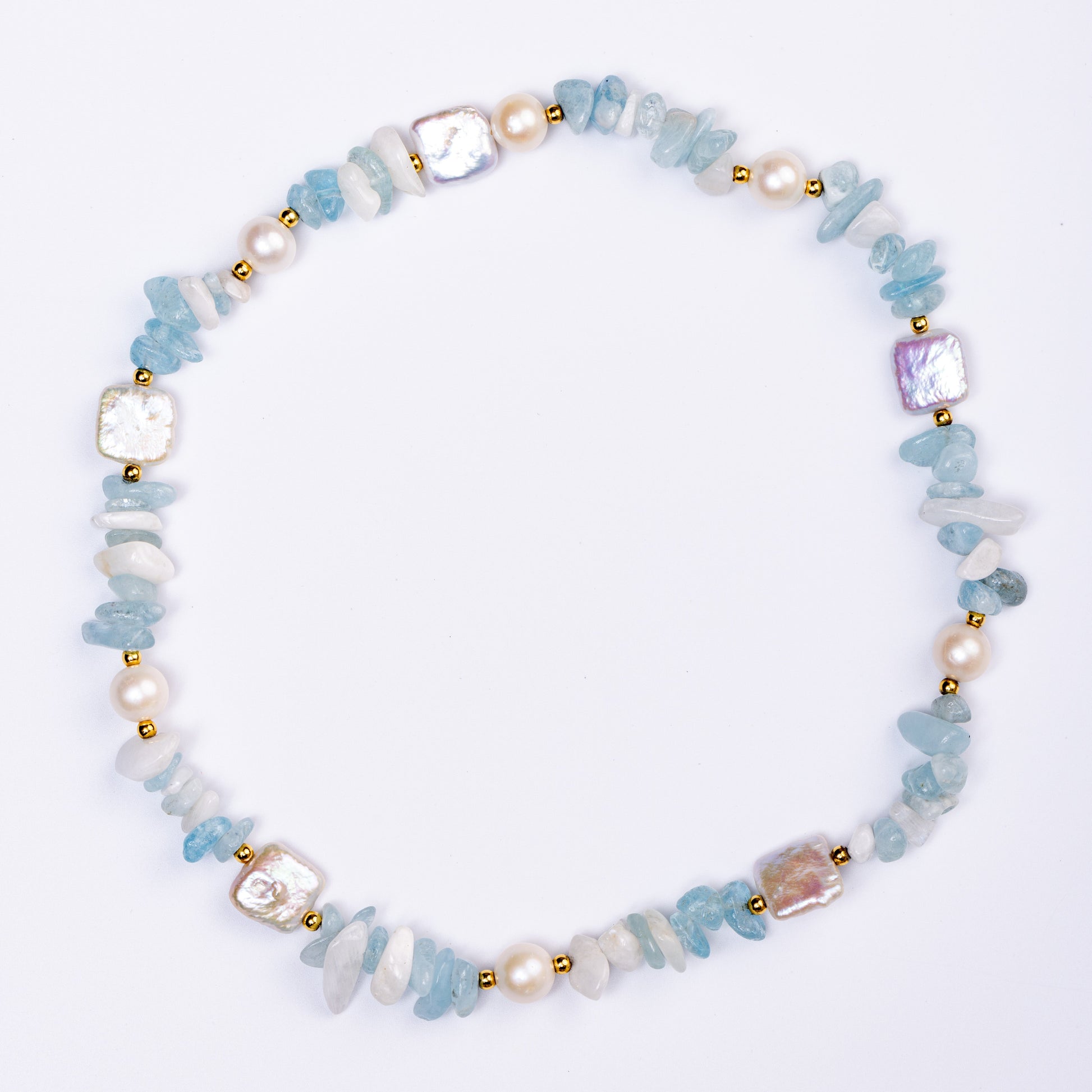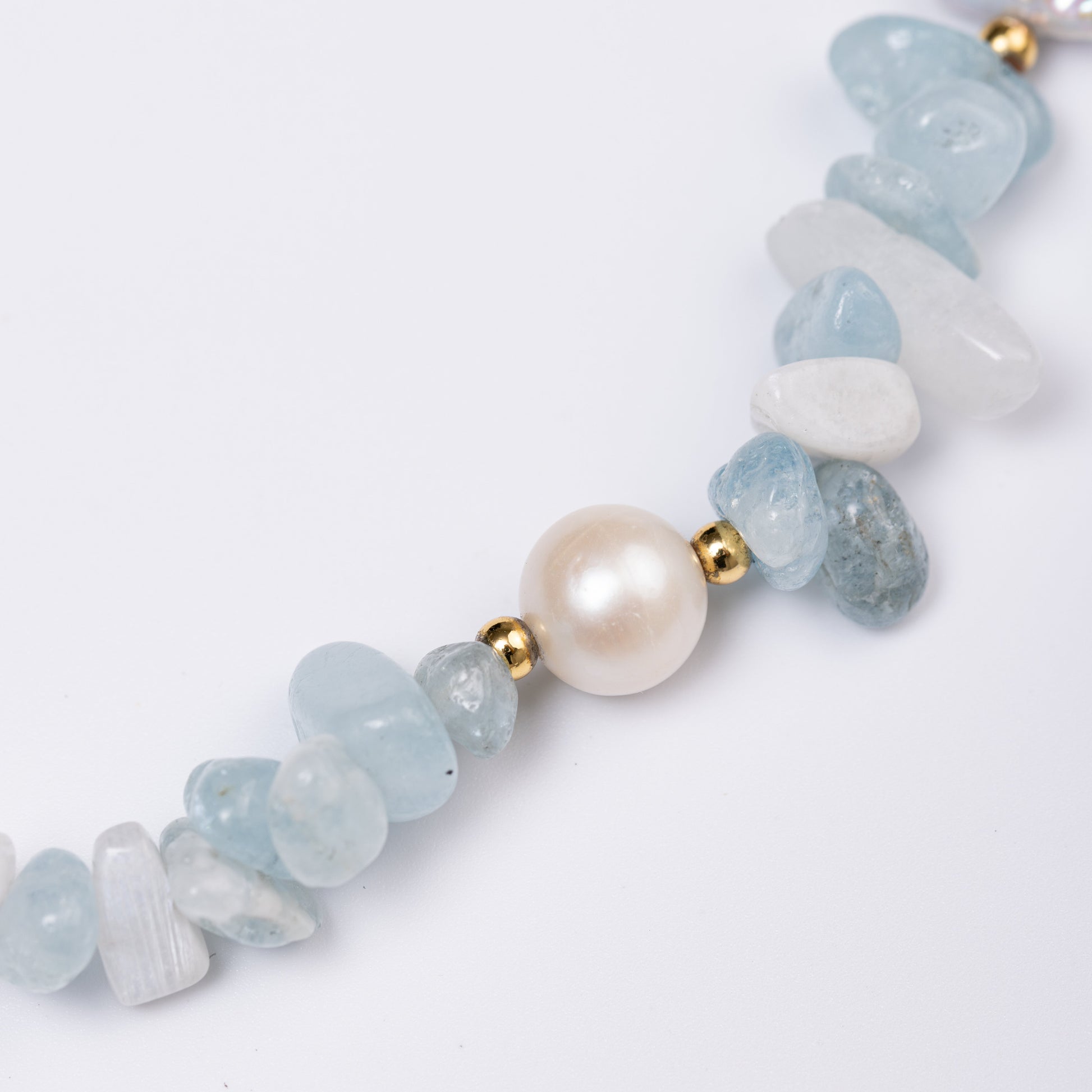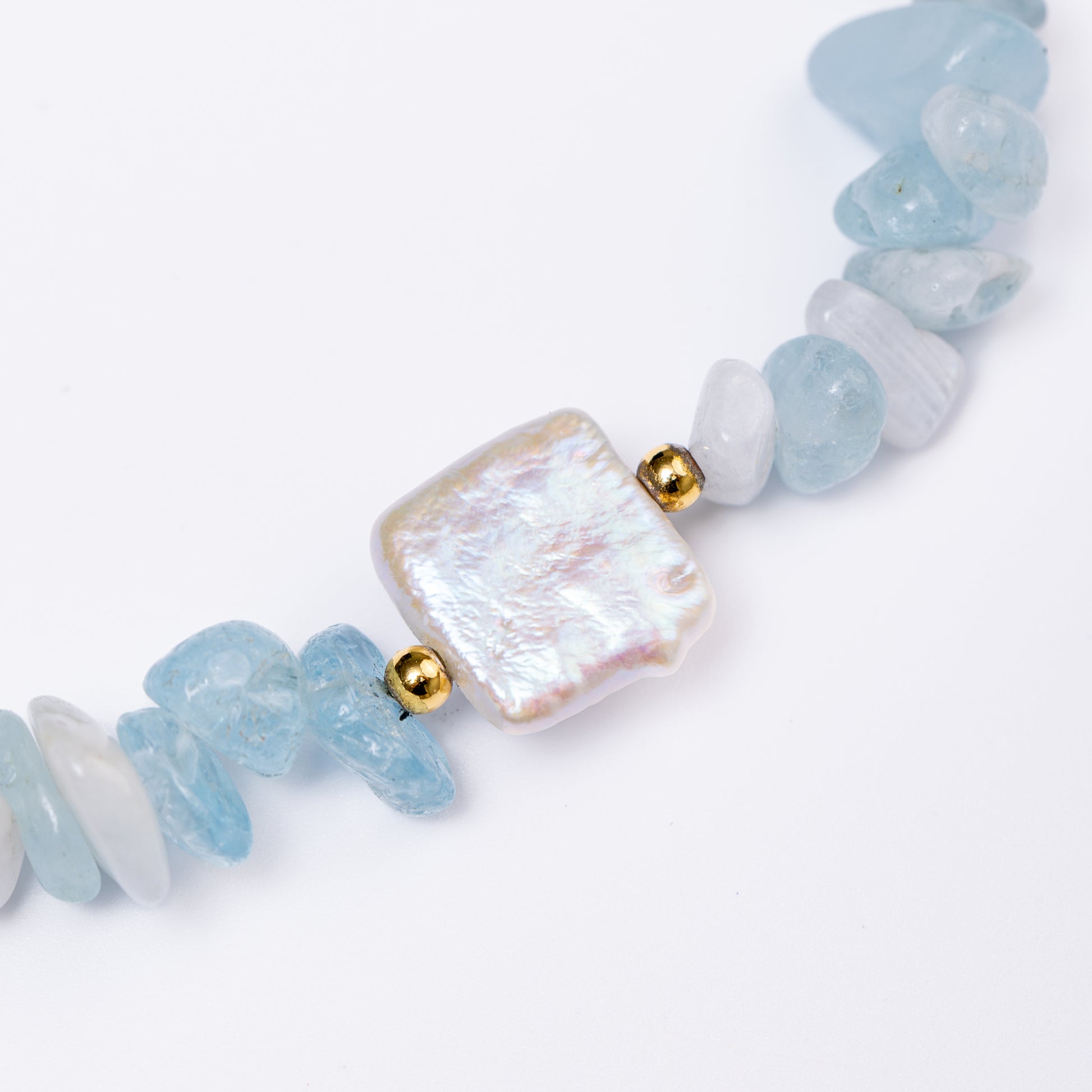 A serene tribute to the sea's eternal dance, this bracelet pairs the tranquil blue of raw Aquamarine slices with the organic glow of irregular Pearl fragments, threaded together with lustrous white seed beads that mimic sea foam kissing the shore.
