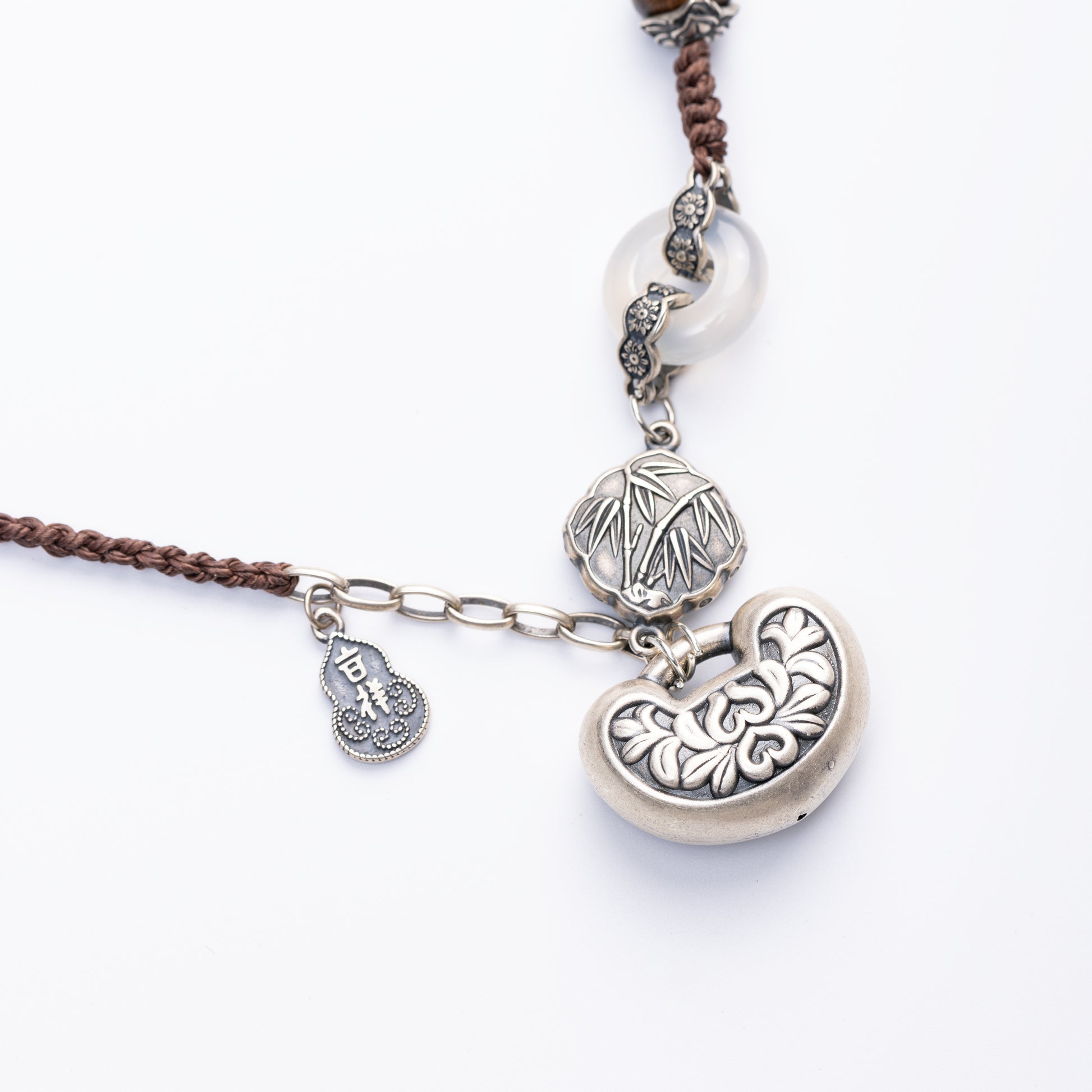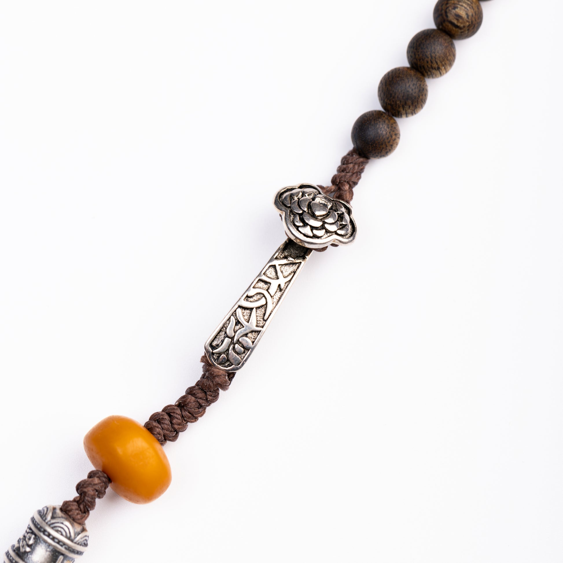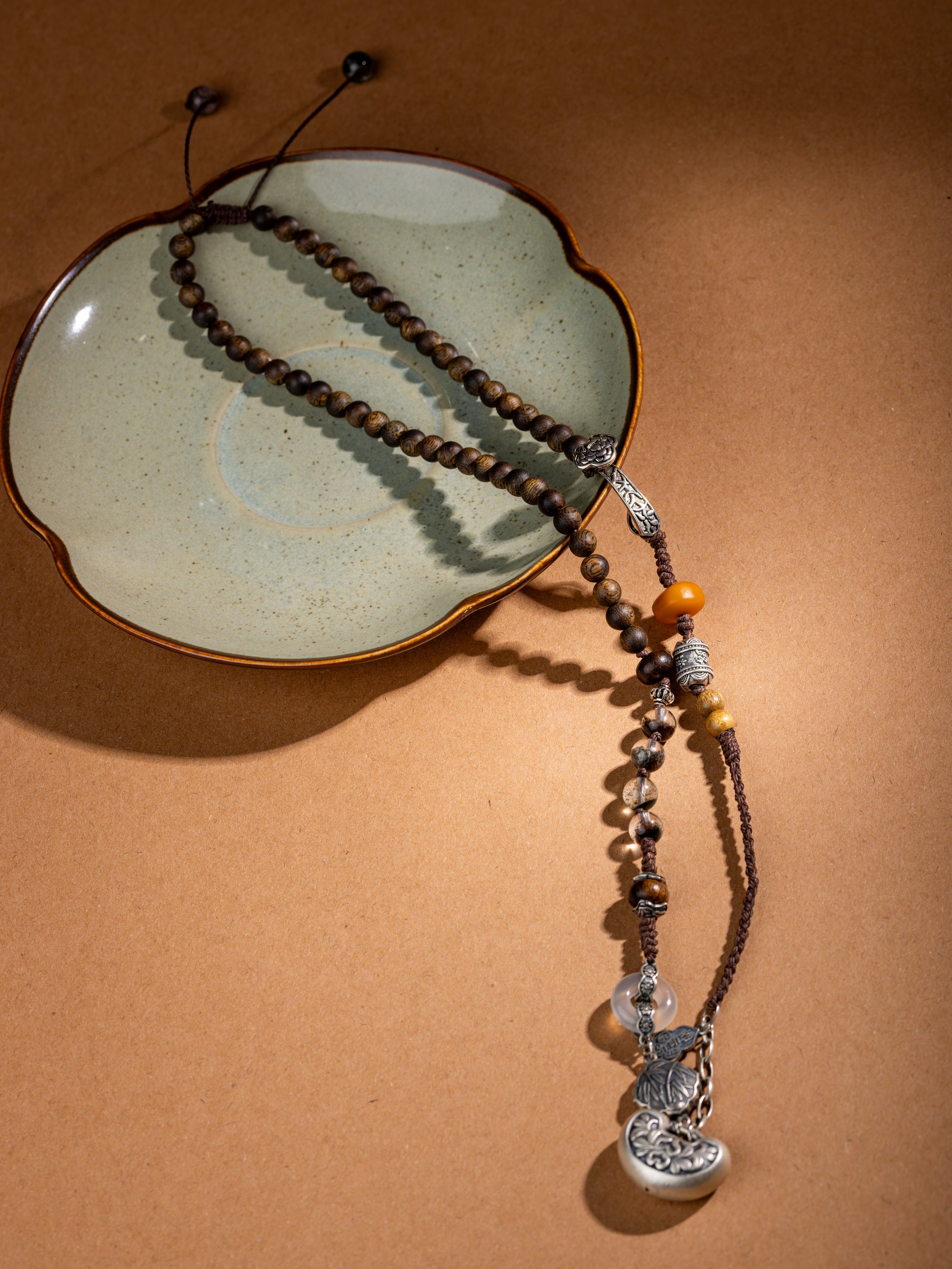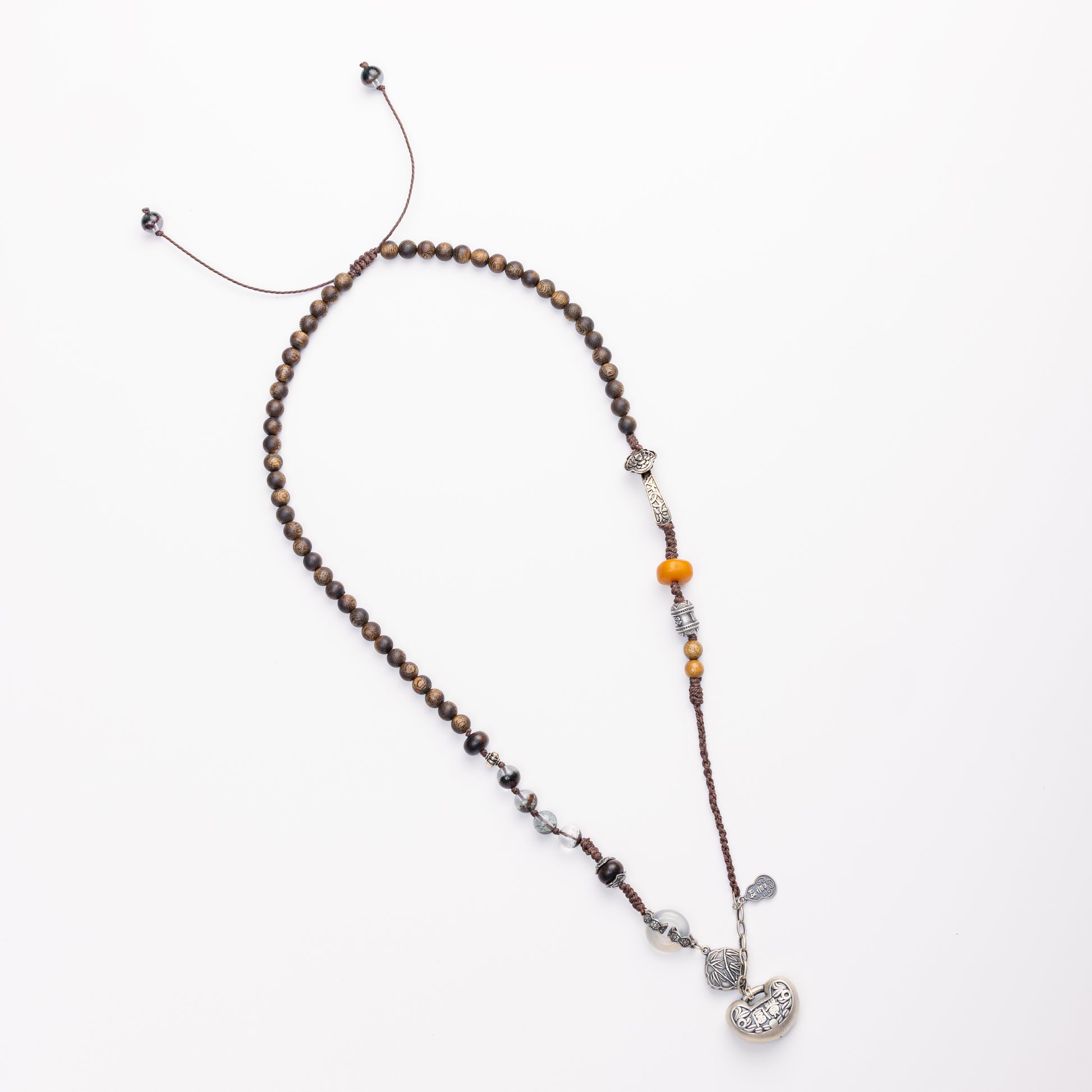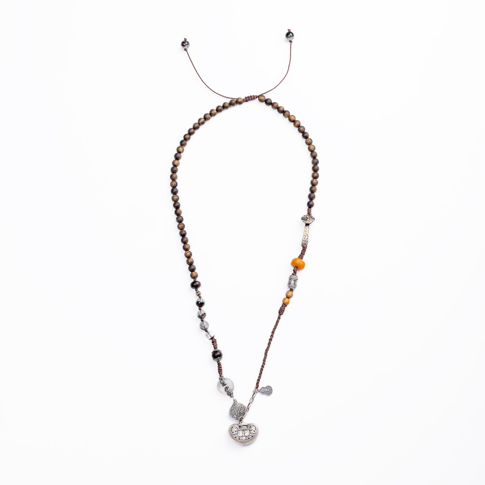 Connect to nature's wisdom with this harmonious necklace, featuring aromatic Agarwood, ChinGuiBao wood, warm Beeswax, Golden Phoebe wood, and mystical Green Phantom Quartz.
