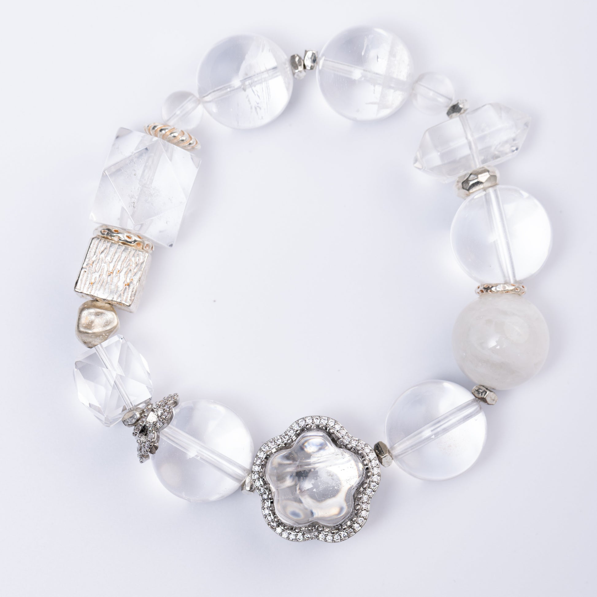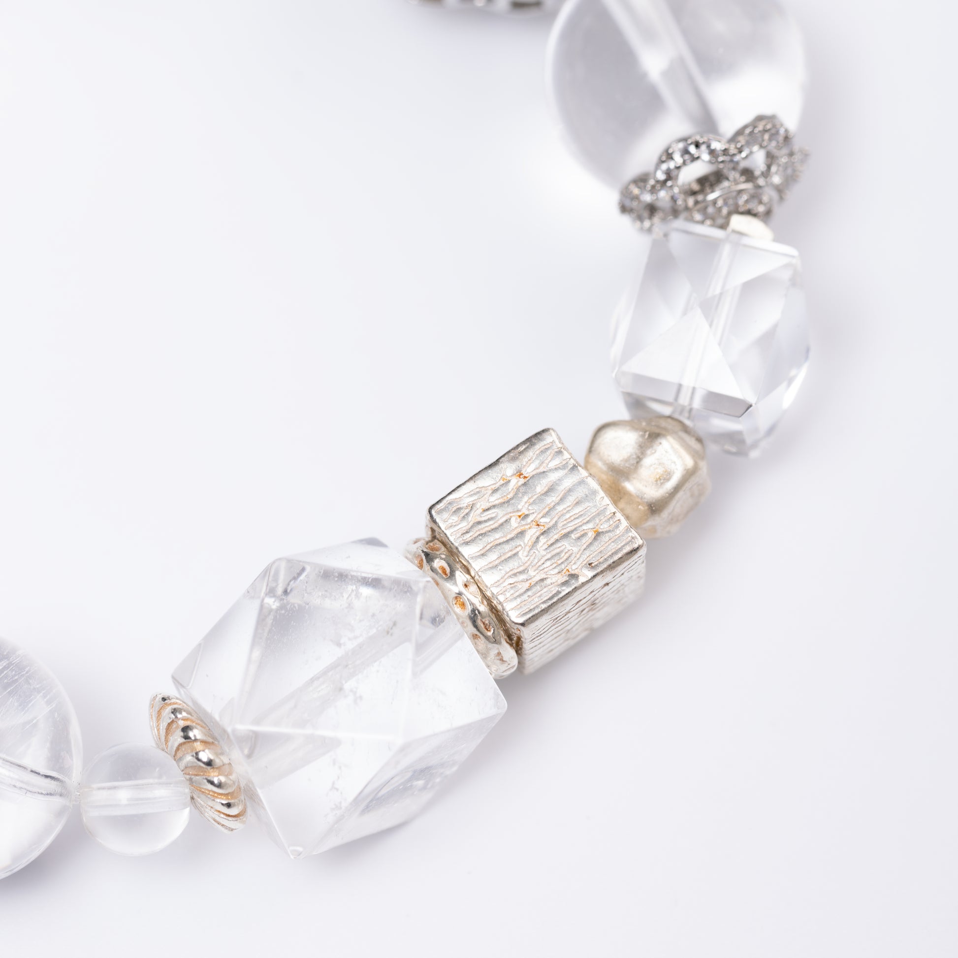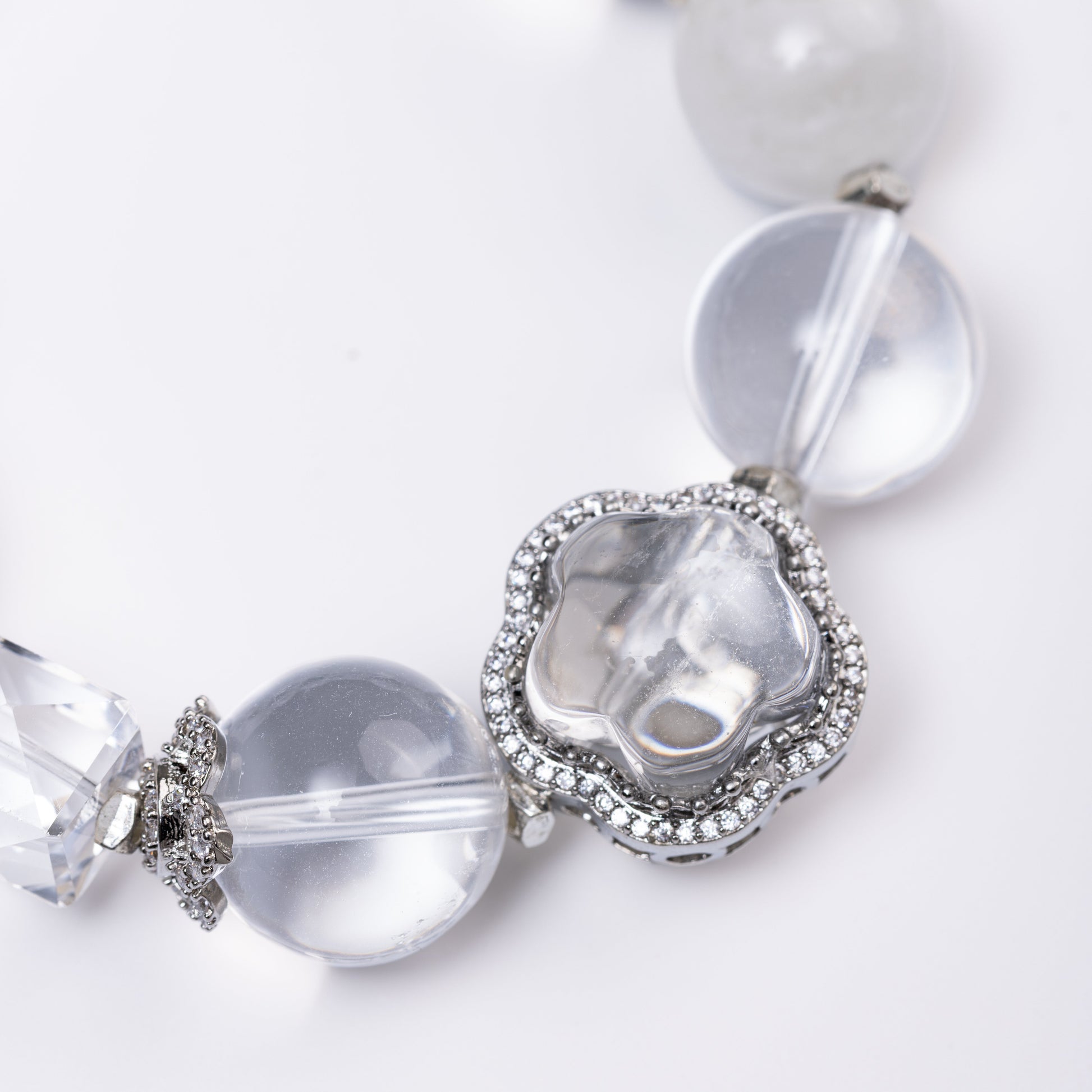 A study in crystalline purity, this bracelet pairs the diamond-like brilliance of facetted Clear Quartz with the ghostly landscapes of White Phantom Quartz, their translucent depths cradling mineral formations like frozen memories. Silver-plated spacers add subtle celestial punctuation.