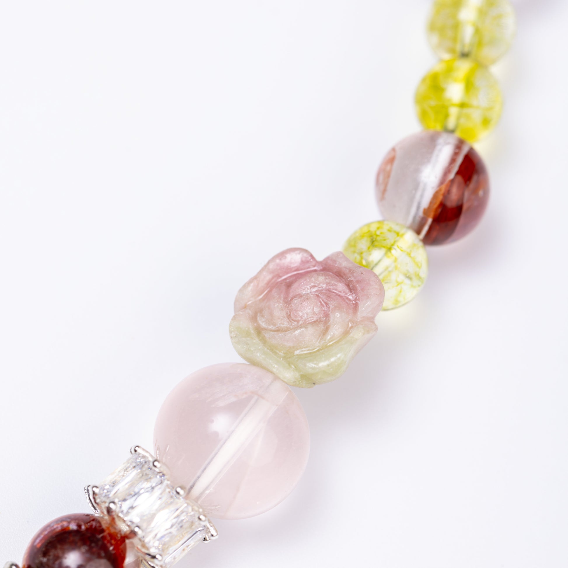 Breathe in the vibrant energy of a blossoming garden with this radiant bracelet, combining the soft pink glow of Rose Quartz, the fresh green vitality of Peridot, and the electric sparkle of Tourmaline—accented with striking Red Phantom Quartz for a bold contrast.