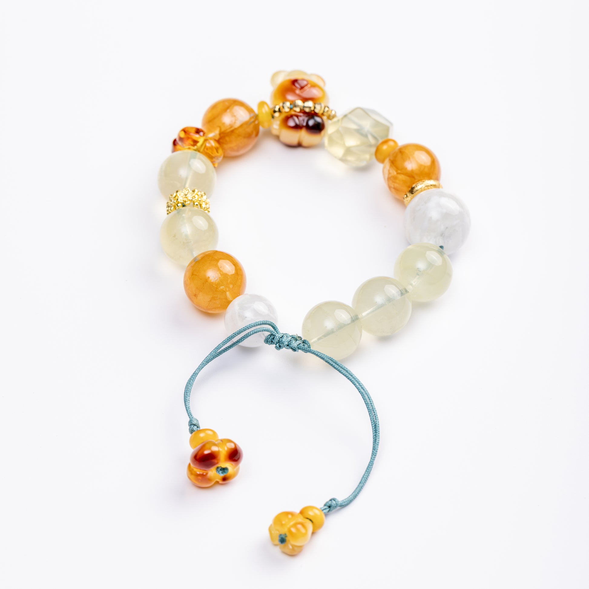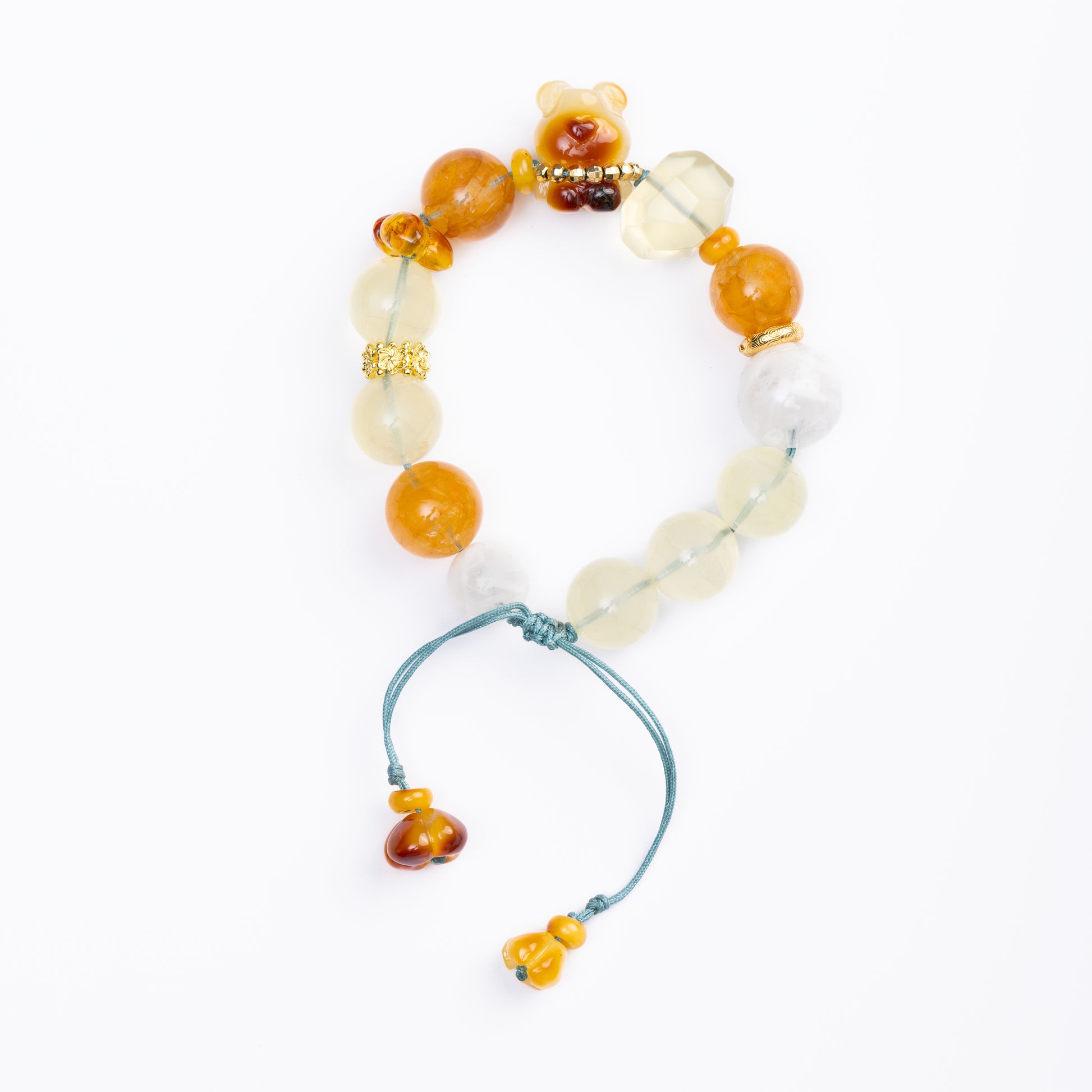 Celebrate joyful abundance with this charming bracelet, featuring bright Lemon Quartz, ethereal White Phantom Quartz, an adorable Beeswax Bear charm, and warm Amber Flower beads.