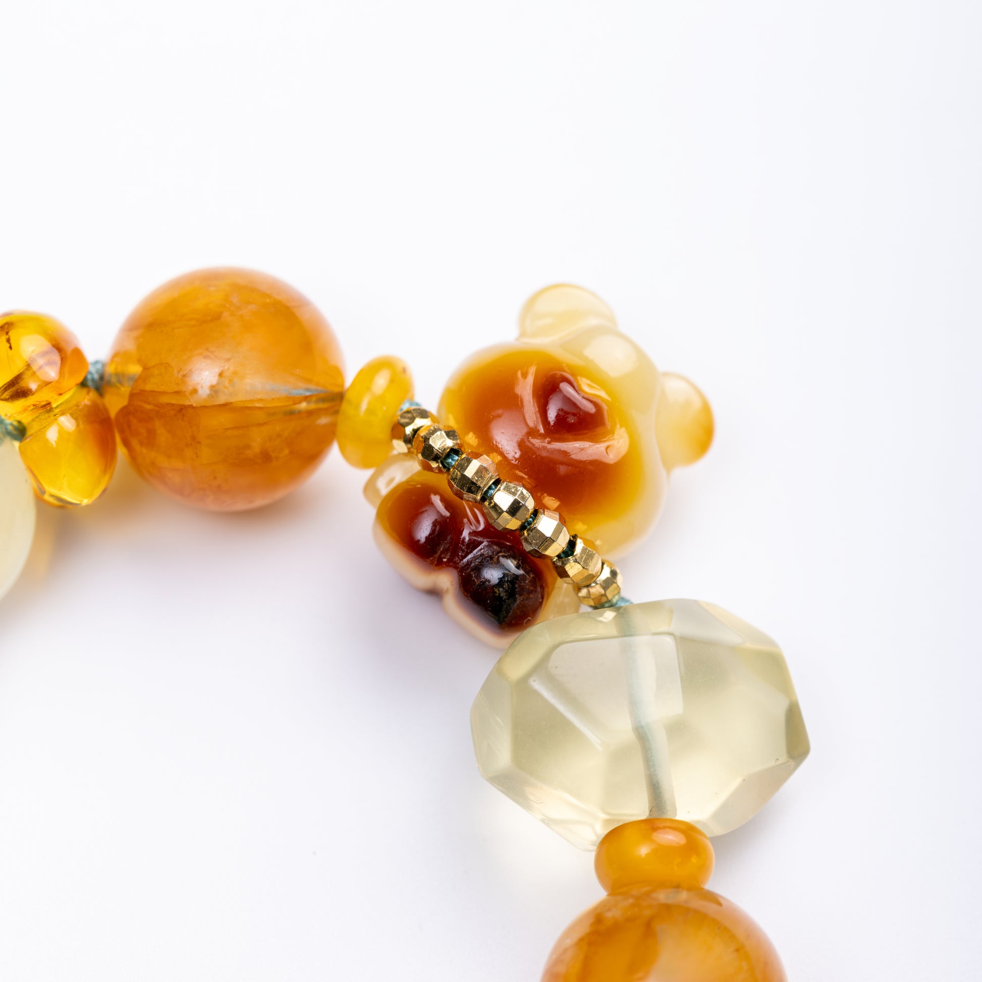 Lemon Quartz radiates sunshine happiness and mental clarity, dissolving worry and enhancing optimistic thinking. White Phantom Quartz carries gentle spiritual growth energy, while the precious Beeswax Bear charm brings protective comfort and childlike wonder. Amber Flower beads add ancient wisdom and golden warmth to complete this sweet symphony.
