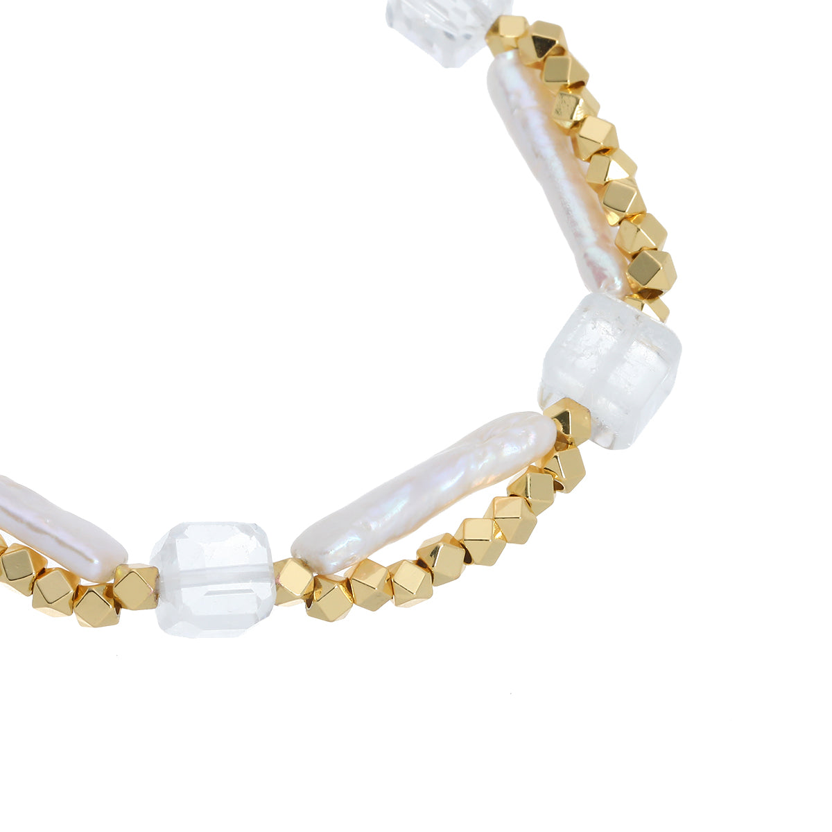 a modern bracelet that balances structured elegance with quiet light. Featuring elongated baroque pearls paired with smooth clear quartz and polished gold accents, this piece brings a refined contrast of texture and clarity. Understated yet distinctive, it evokes the kind of glow that lives in clean silhouettes and soft reflections.