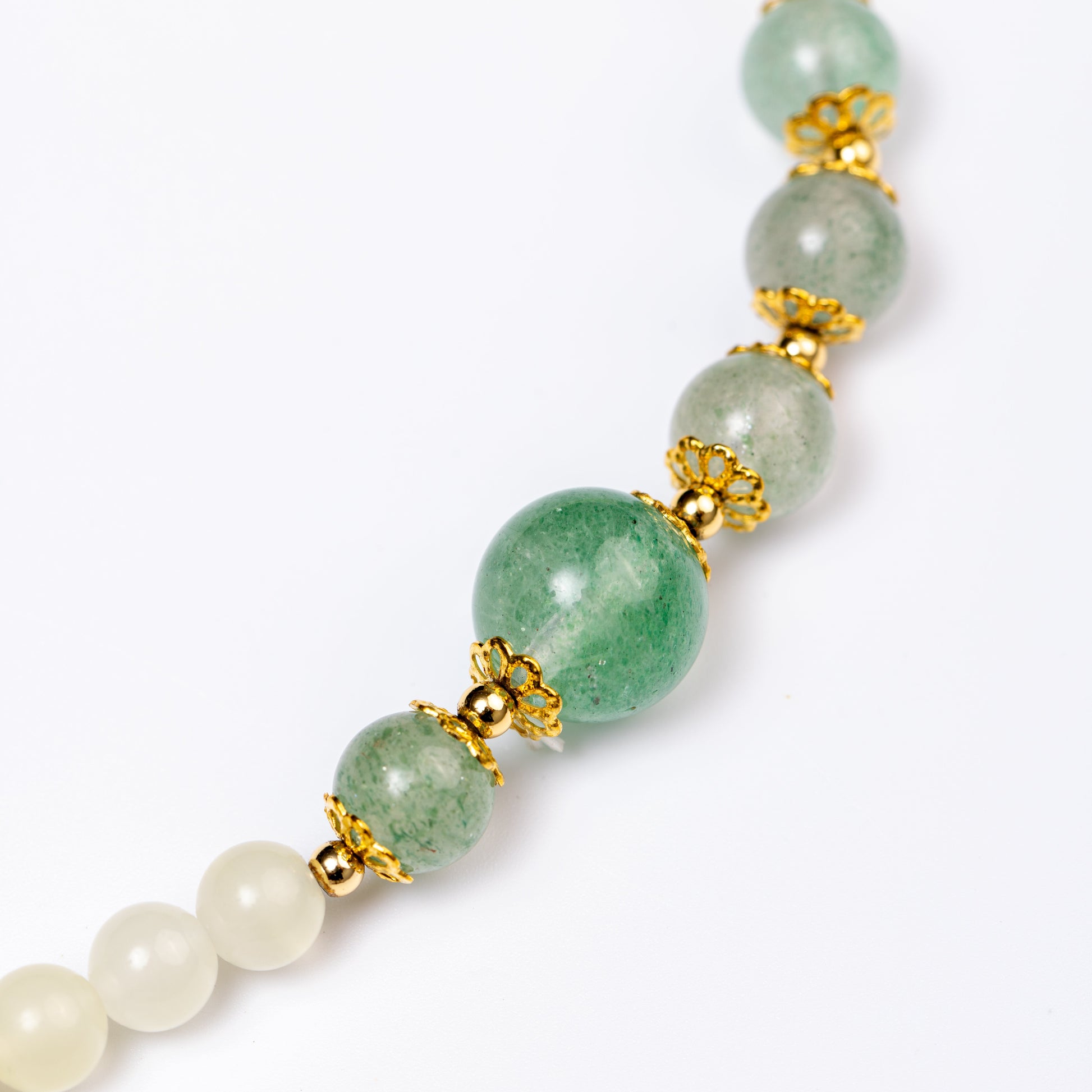 The Strawberry Quartz beads, with their signature strawberry seed inclusions, radiate playful energy and attract joyful connections. Green Aventurine, known as the "Stone of Opportunity," carries the essence of new beginnings and prosperity. Together, they form a potent duo for manifesting love and luck—one sweet, one verdant, both brimming with life force.