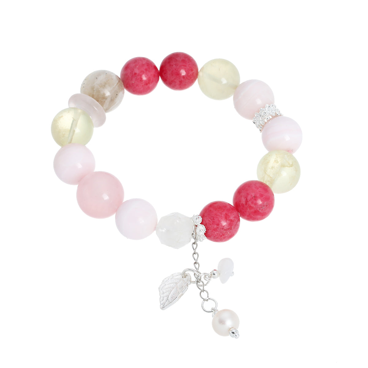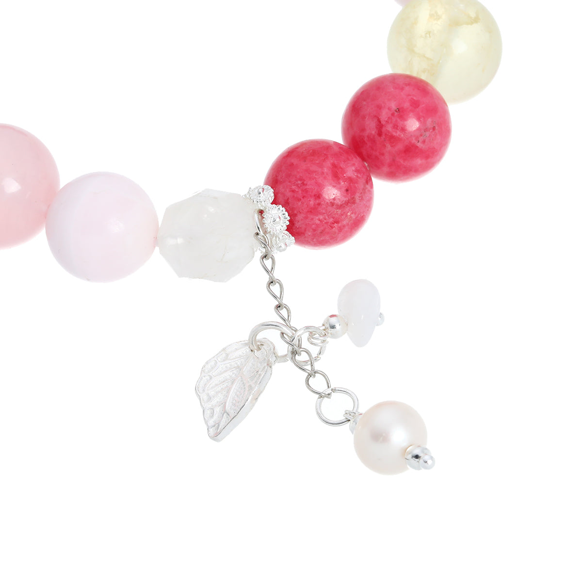 With rose rhodonite and pink opal at its heart, the piece offers emotional grounding and gentle healing. Rhodonite soothes and strengthens — a stone of inner balance and compassion. Pink opal brings light to the heart, dissolving tension with kindness. Accents of lemon quartz and grapefruit-hued strawberry quartz infuse a sense of brightness and calm energy, while natural pearls and glints of aura shimmer reflect beauty in softness. Finished with jade fragments and a silver leaf, it feels like sunlight filtered through petals.