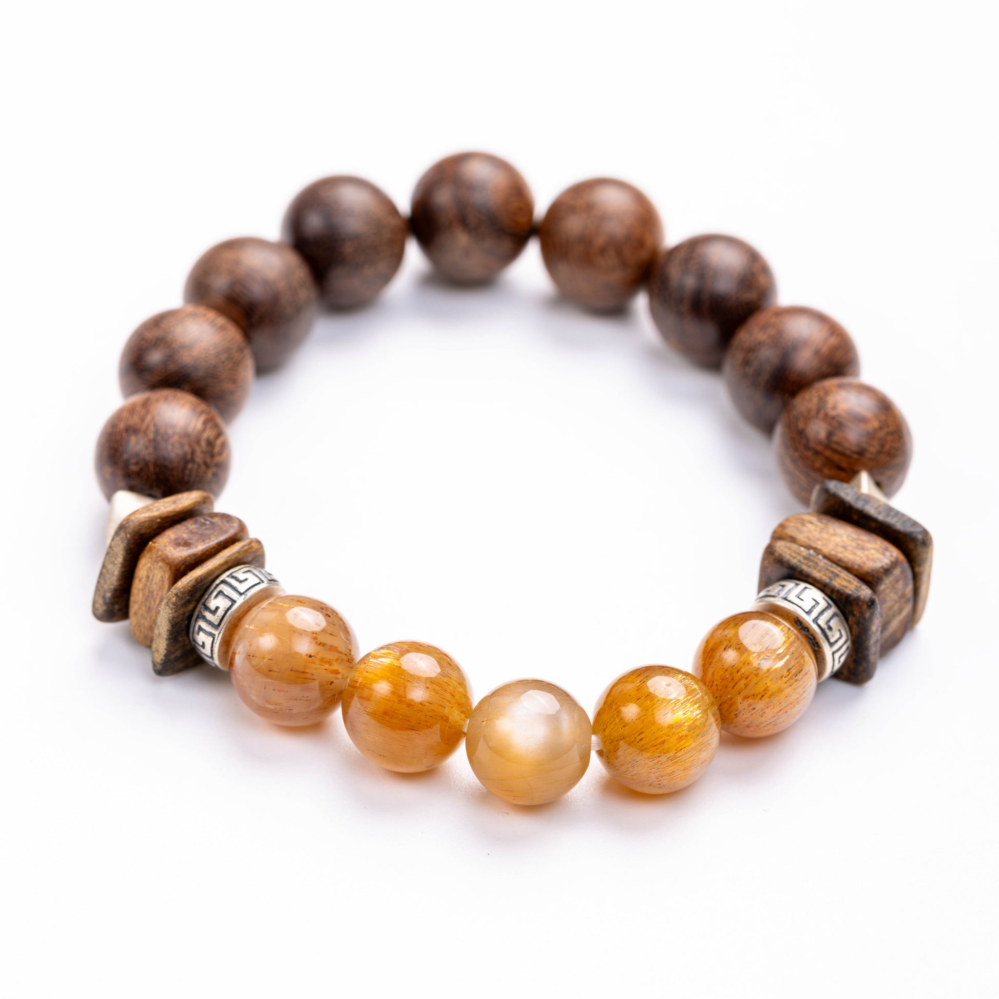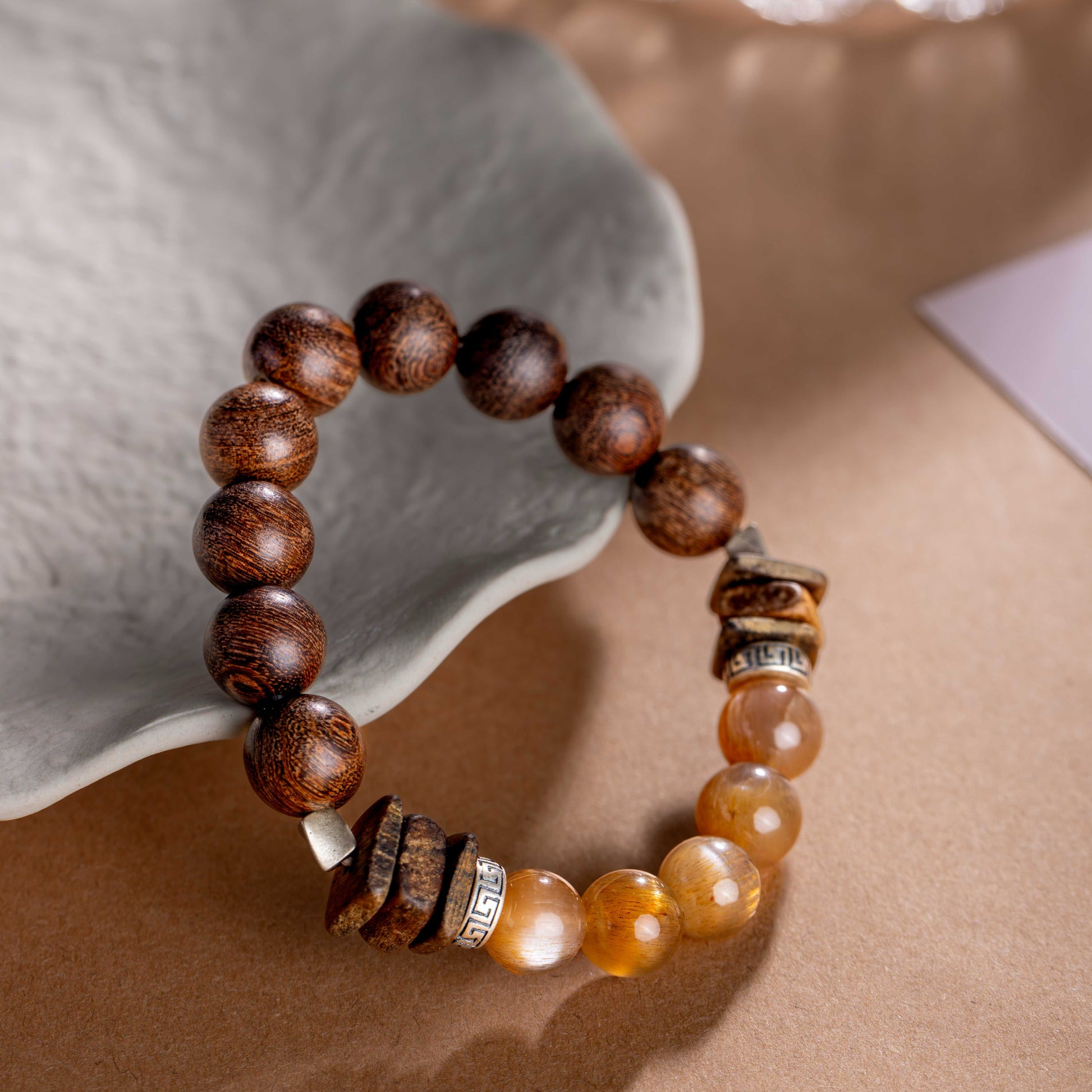Carry timeless connection with this elastic bracelet, featuring raw Skeleton Quartz, Golden Phoebe wood, and HuiZi-pattern spacers.