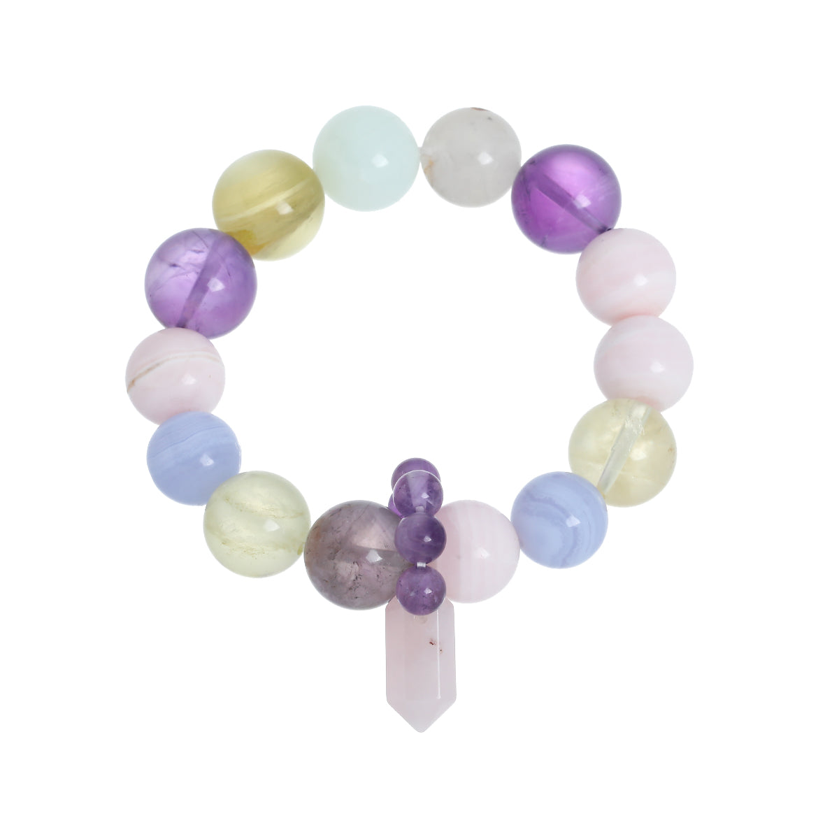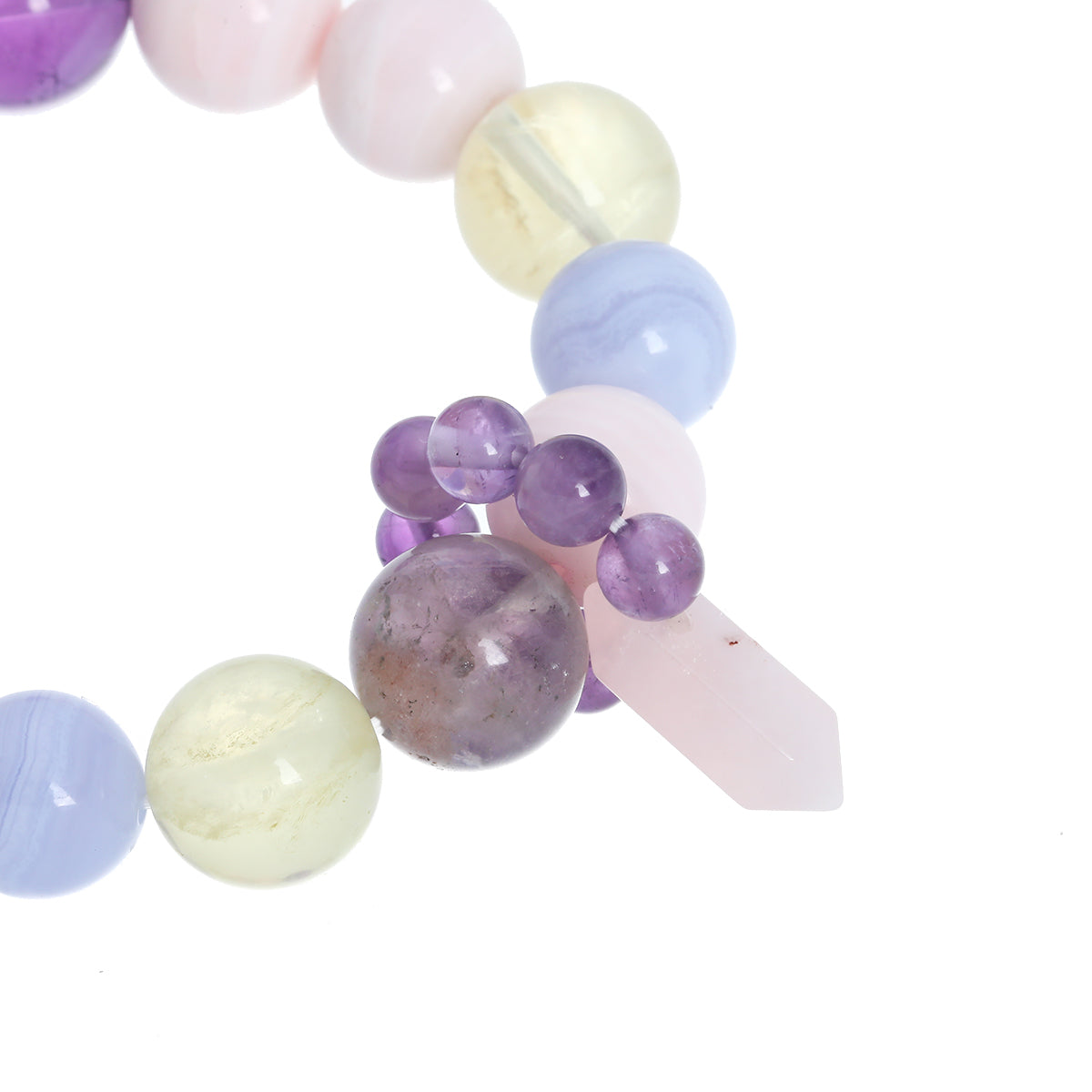 This piece holds the shimmer of intuition and the glow of emotional resonance.Centered around amethyst, pink opal, and purple agate, the bracelet brings together soft mysticism and radiant calm. Amethyst, long regarded as a stone of clarity and spiritual protection, helps still the mind and deepen awareness. Pink opal radiates gentle joy, easing emotional tension and opening the heart to softness. Purple agate grounds emotional energy with quiet depth, encouraging inner peace and resilience. Accents of golden lepidolite, lemon quartz, green opal, and aurora-like shimmer stones create a constellation of shifting light — a balance of the celestial and the deeply personal.