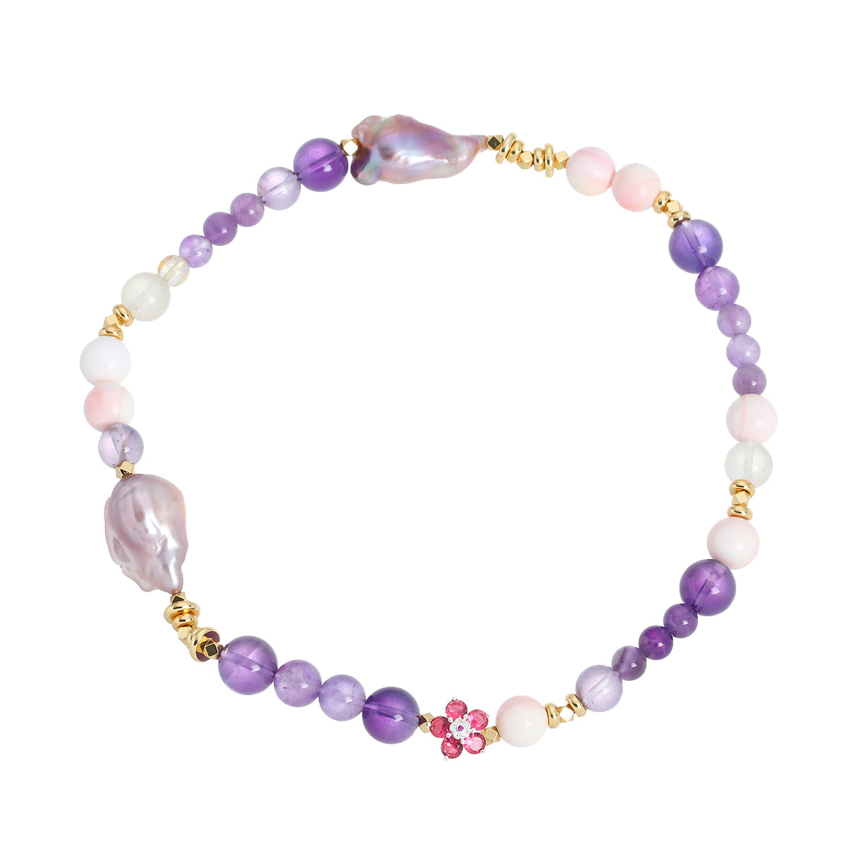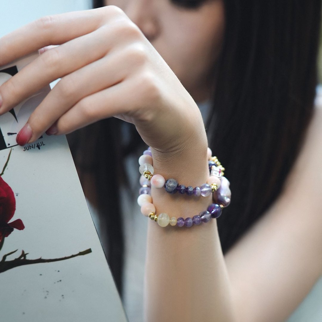 A refined bracelet that brings together the soft shimmer of mother of pearl and the calming clarity of amethyst. Known for enhancing intuition and inner peace, amethyst gently centers the heart, while mother of pearl nurtures softness and emotional balance. The mix of bead sizes adds rhythm and depth, making it a subtle yet meaningful everyday piece.