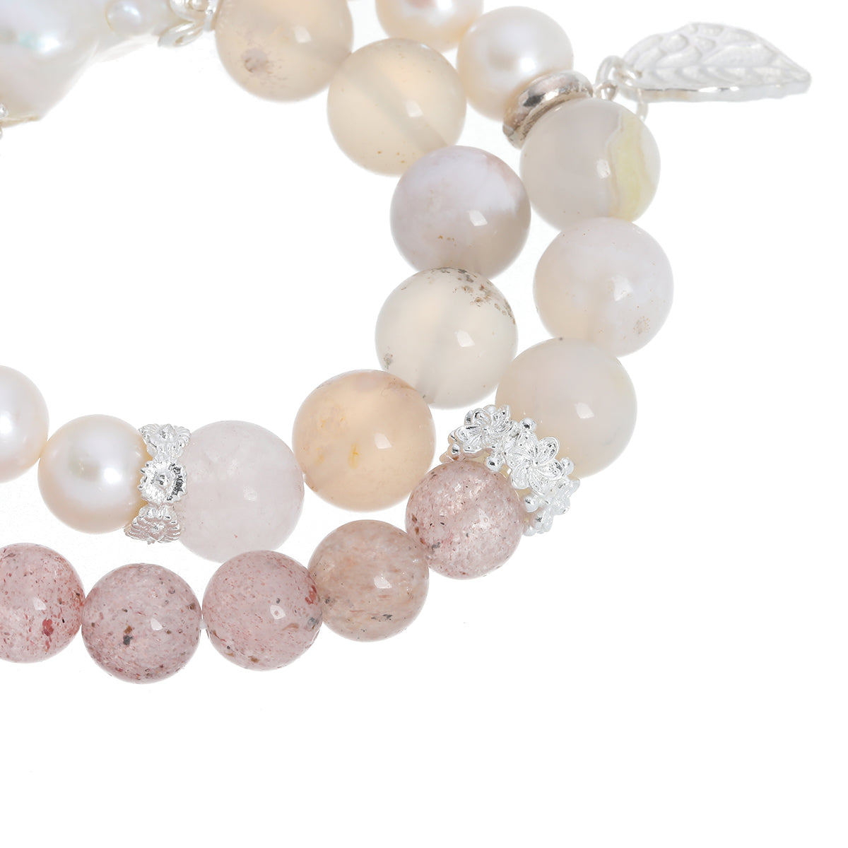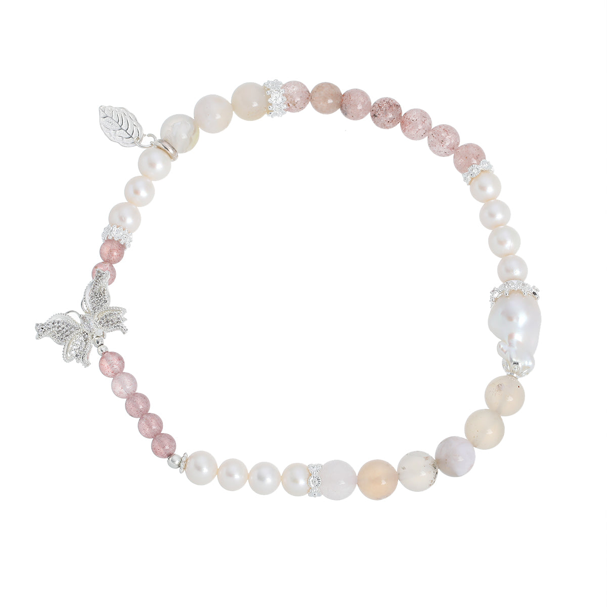 • Materials: Natural Pearl , Strawberry Quartz, Cherry Blossom Agate , Zircon Butterfly, Sterling Silver Leaf, 7A Icy Strawberry Beads, Rhodium-Plated 6-Eye Connector, Silver Beads