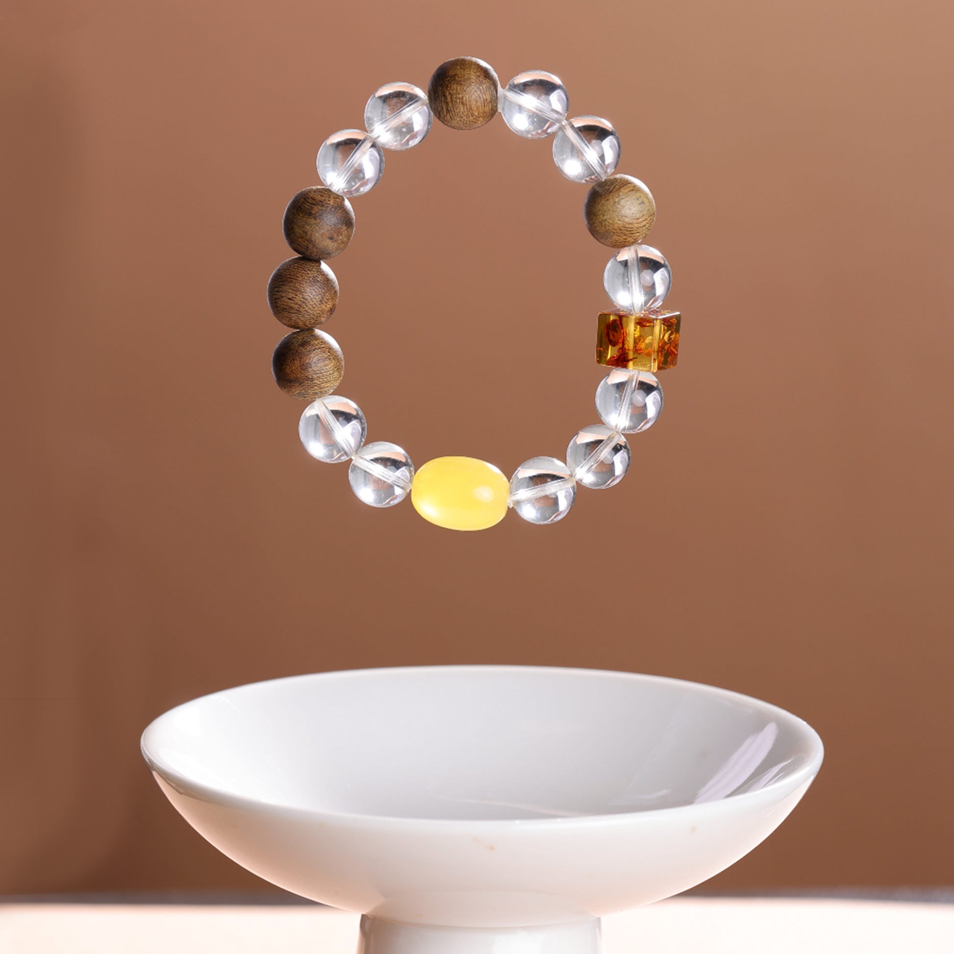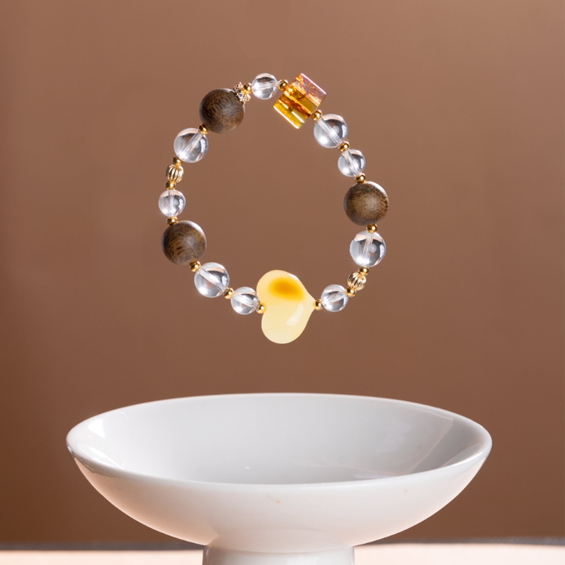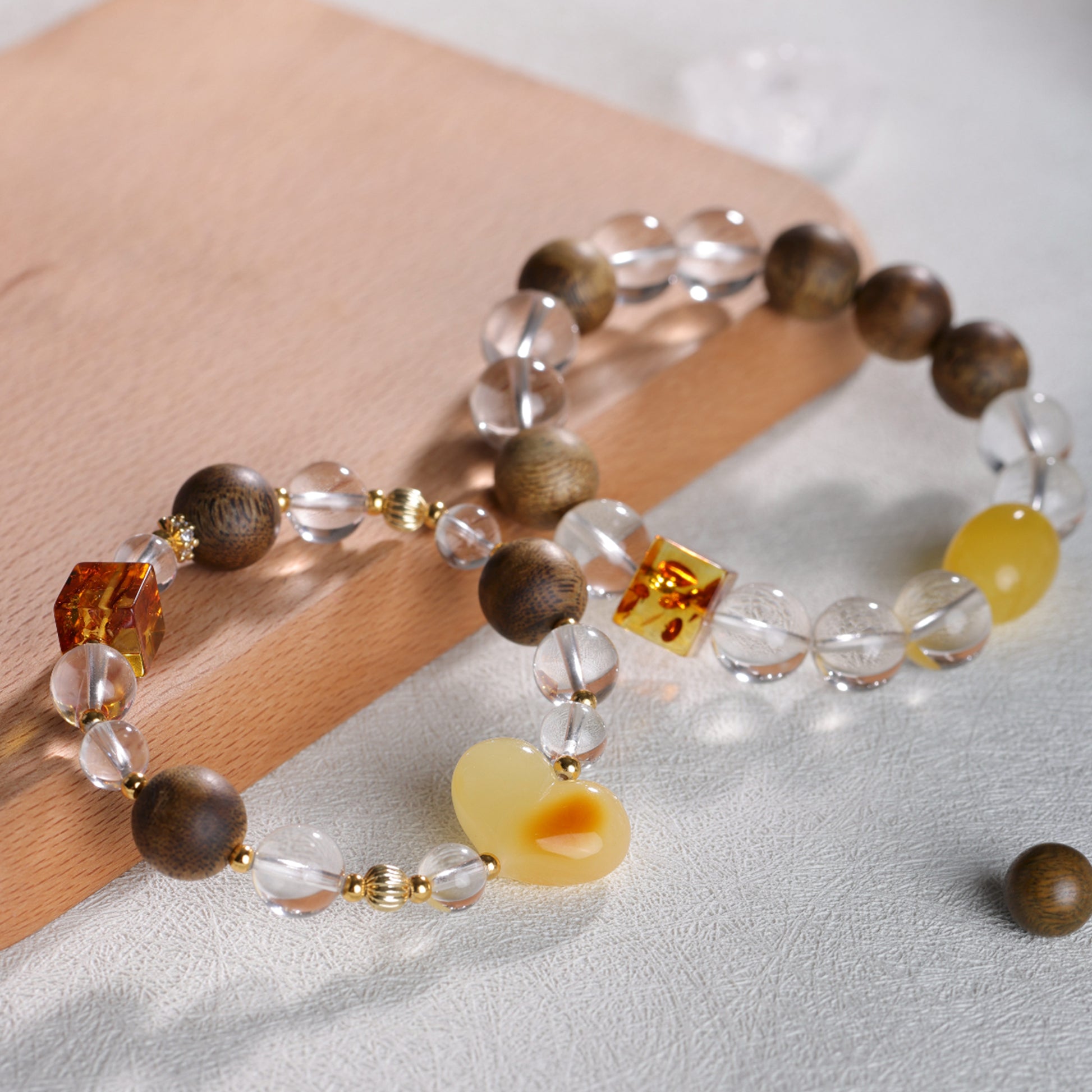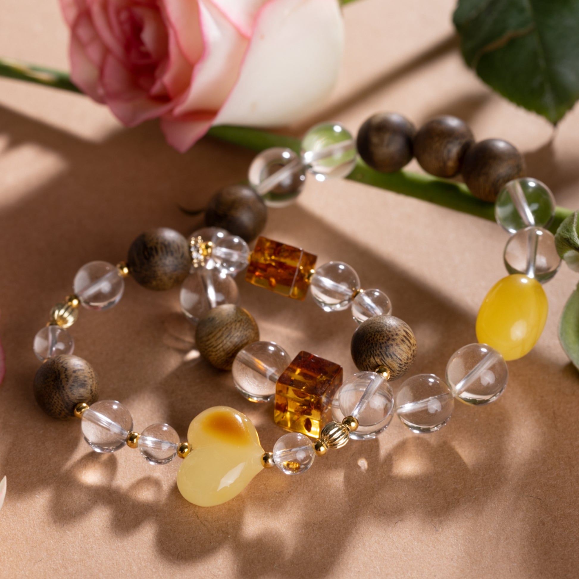 Share the warmth of love with this pair of matching elastic bracelets, crafted from a balanced blend of Clear Quartz, Agarwood, and Beeswax Peach—accented with Beeswax Cube and Clear Quartz beads. Transparent crystal tones glow against warm honeyed hues, while natural wood adds grounding wisdom.