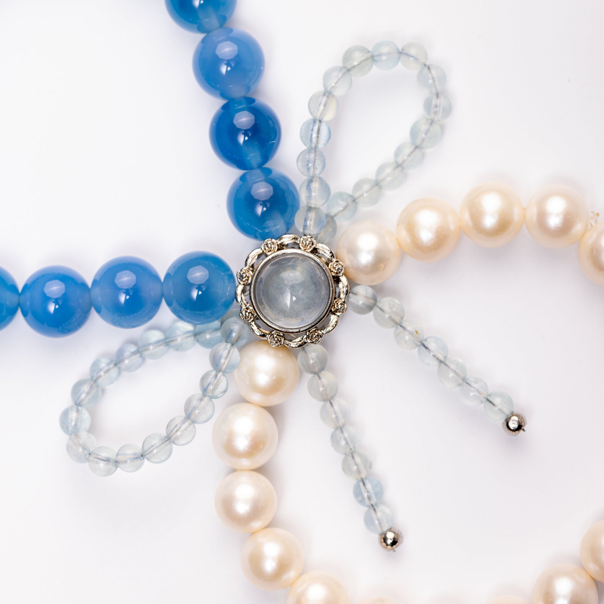 A crystalline ode to the sea's most refined whispers, this bracelet marries the delicate lace-like patterns of Blue Lace Agate with the liquid clarity of Aquamarine, punctuated by the luminous glow of Saltwater Pearls. Silver spacer beads mimic sunlight glancing off wave crests.