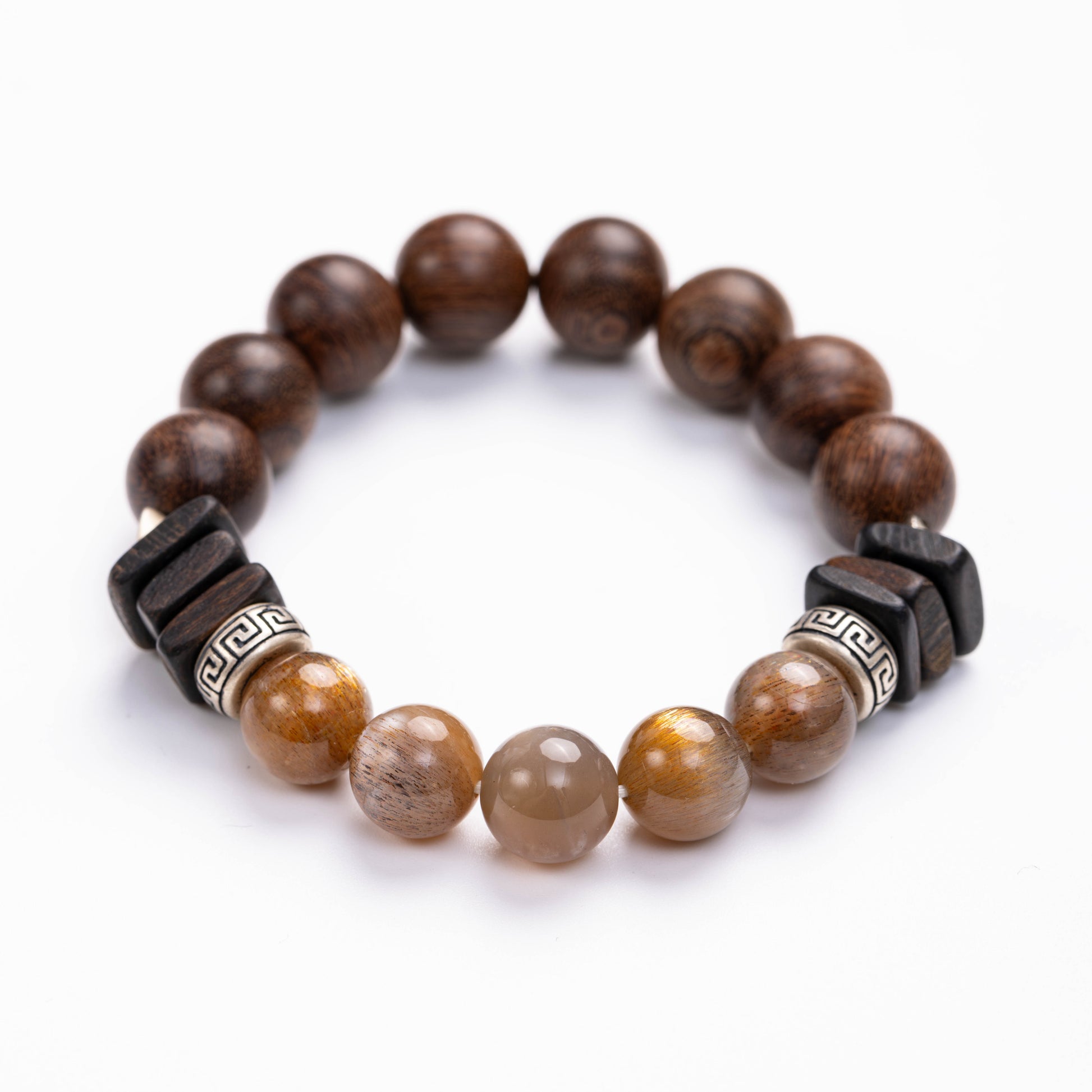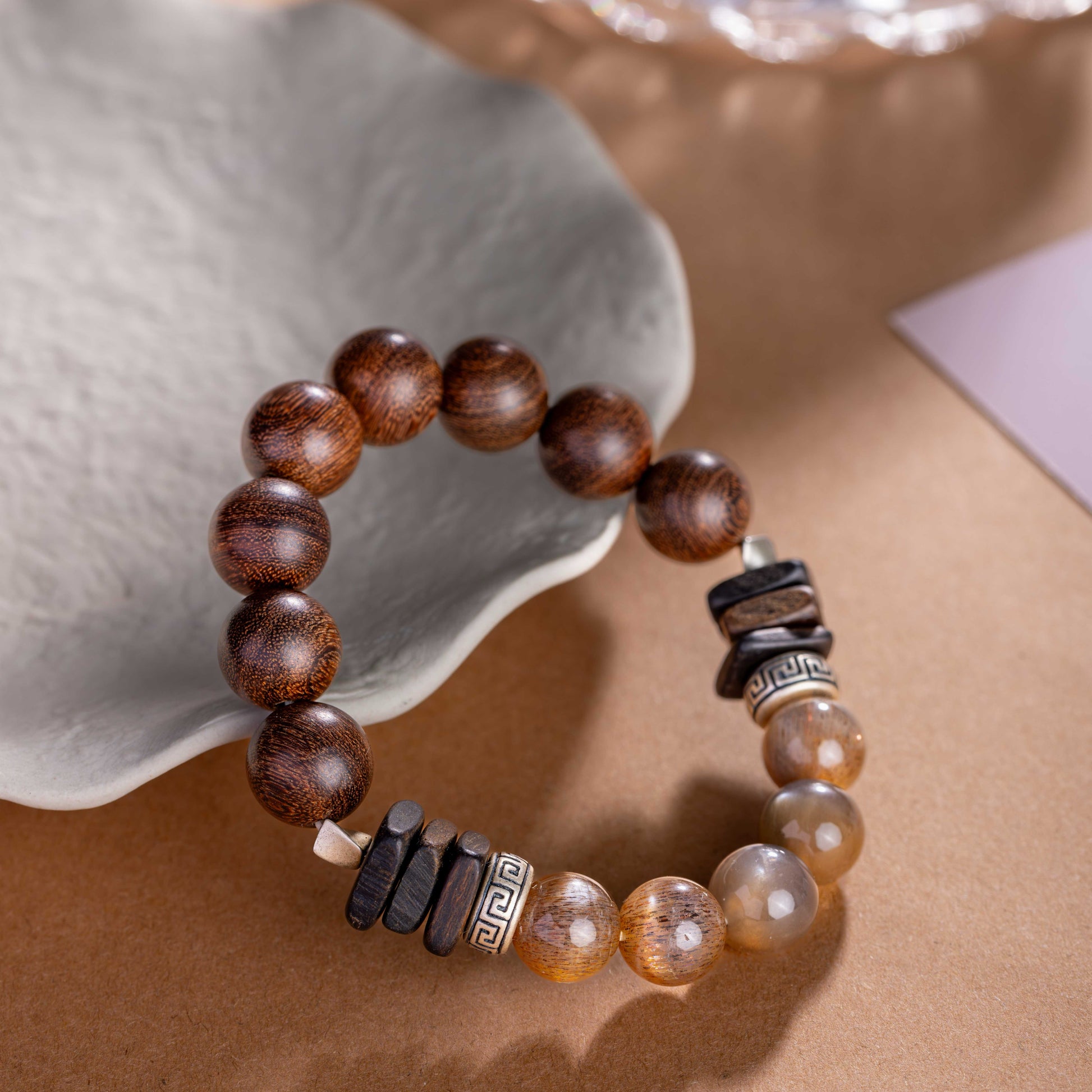 Carry timeless bonds with this elastic bracelet, crafted from raw Skeleton Quartz, warm Golden Phoebe wood, and HuiZi-pattern spacers.